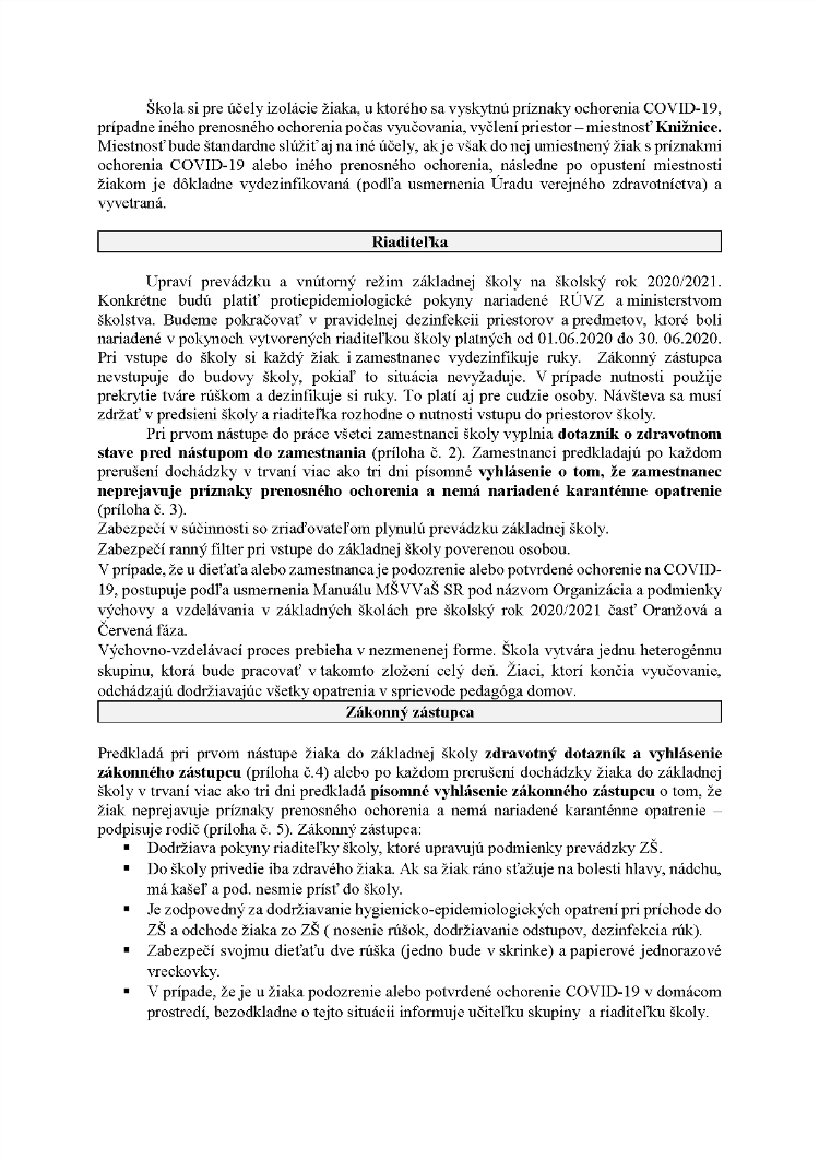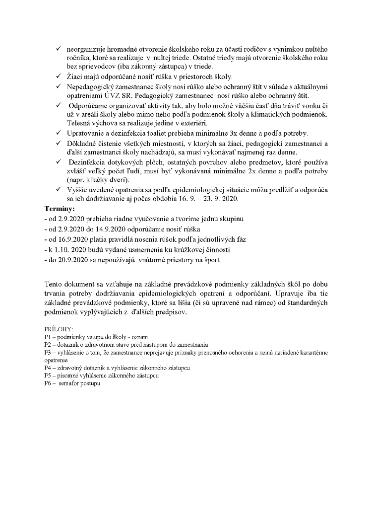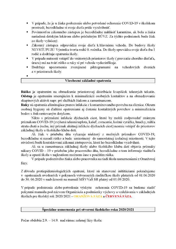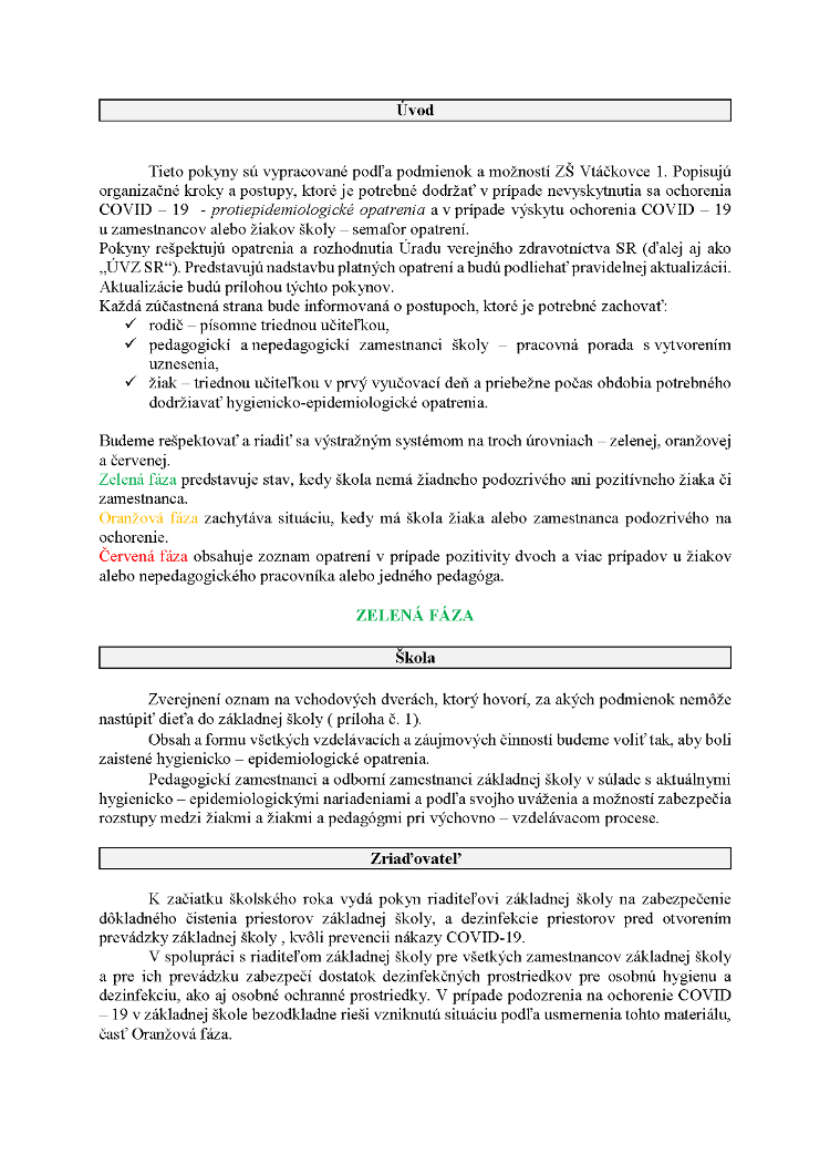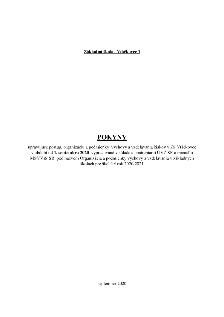 POKYNY upravujúce postup, organizáciu a podmienky výchovy a vzdelávania žiakov v ZŠ Vtáčkovce v období od 1. septembra 2020