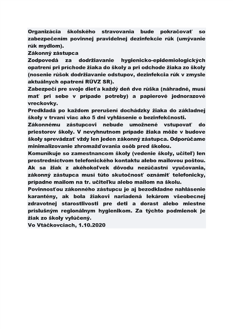 Základná škola Vtáčkovce 1 - Usmernenie počas obdobia 01.10.2020 do odvolania.